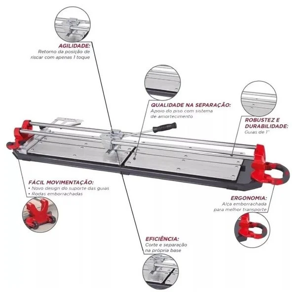 Tempo é um recurso valioso na sua obra. Por isso, este equipamento foi pensado para maximizar sua agilidade. O sistema de separação integrado à base permite que você risque e separe a peça no mesmo local, sem a necessidade de movimentos extras. Com um design ergonômico e um mecanismo que reduz a força necessária para a quebra, você assenta mais metros quadrados por dia, com menos esforço e mais rapidez.